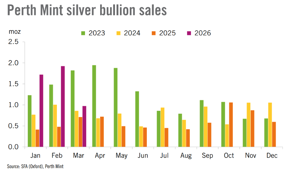 他们写道:“珀斯铸币厂(Perth Mint)3月份的银条和银币销量为97.645万盎司,较2月份的近200万盎司大幅下降,2月份的销量是两年多来最大的单月销量。投资者利用截至2月初的急剧抛售增加了头寸。第一季度总销量超过460万盎司,2026年的开局比2025年强劲得多。”