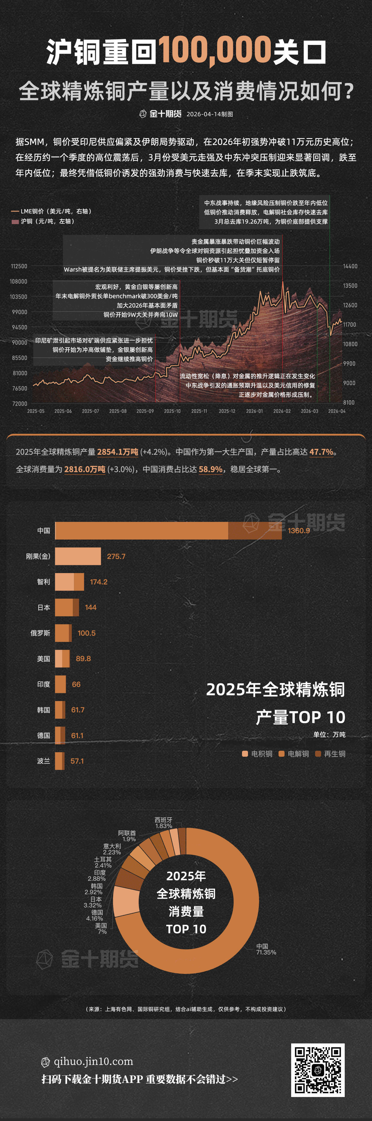 6小时前 沪铜重回10万关口,全球精炼铜产量以及消费情况如何? | 金十期货热图