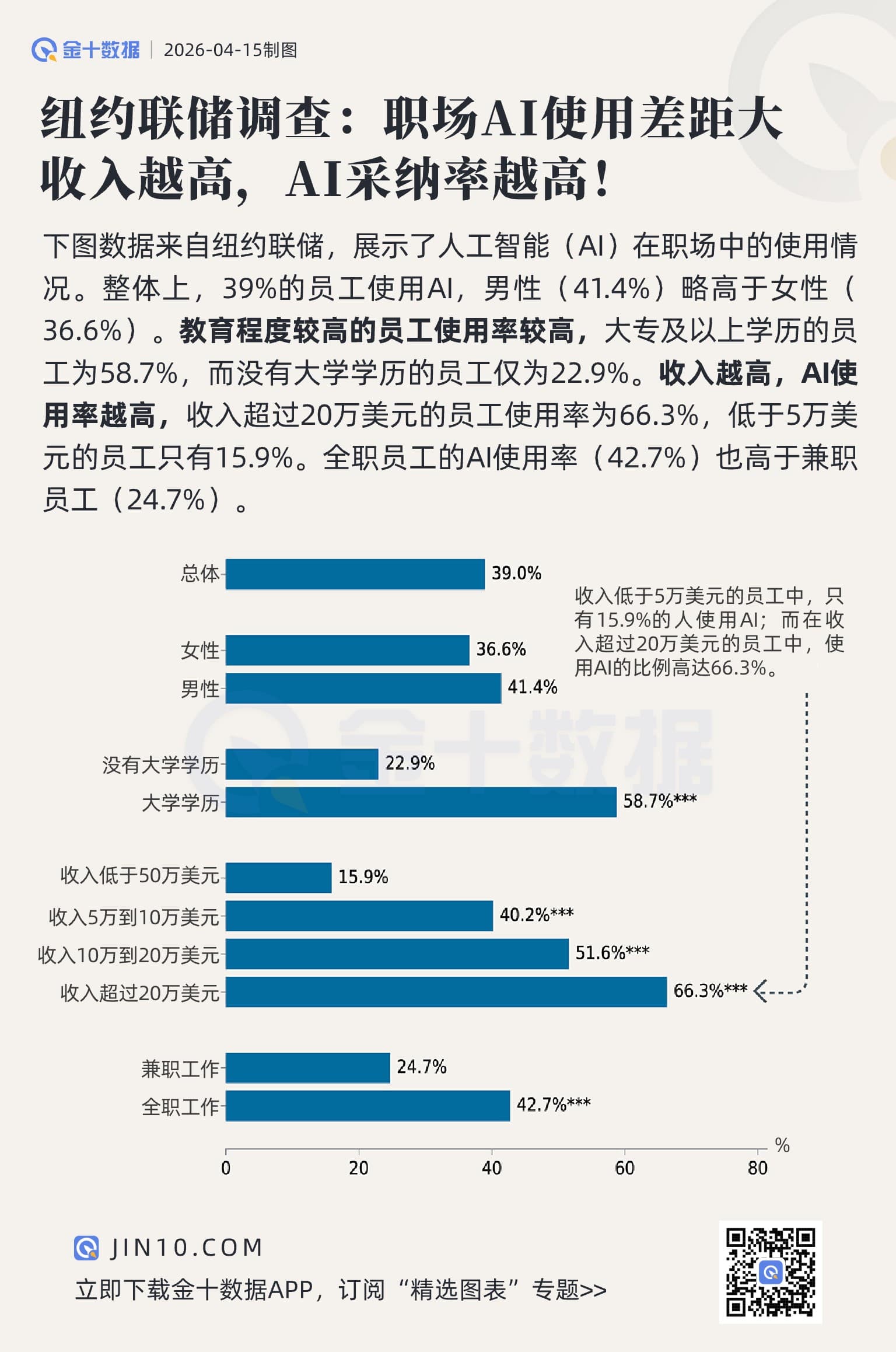 11小时前 纽约联储调查:职场AI使用差距大,收入越高,AI采纳率越高!