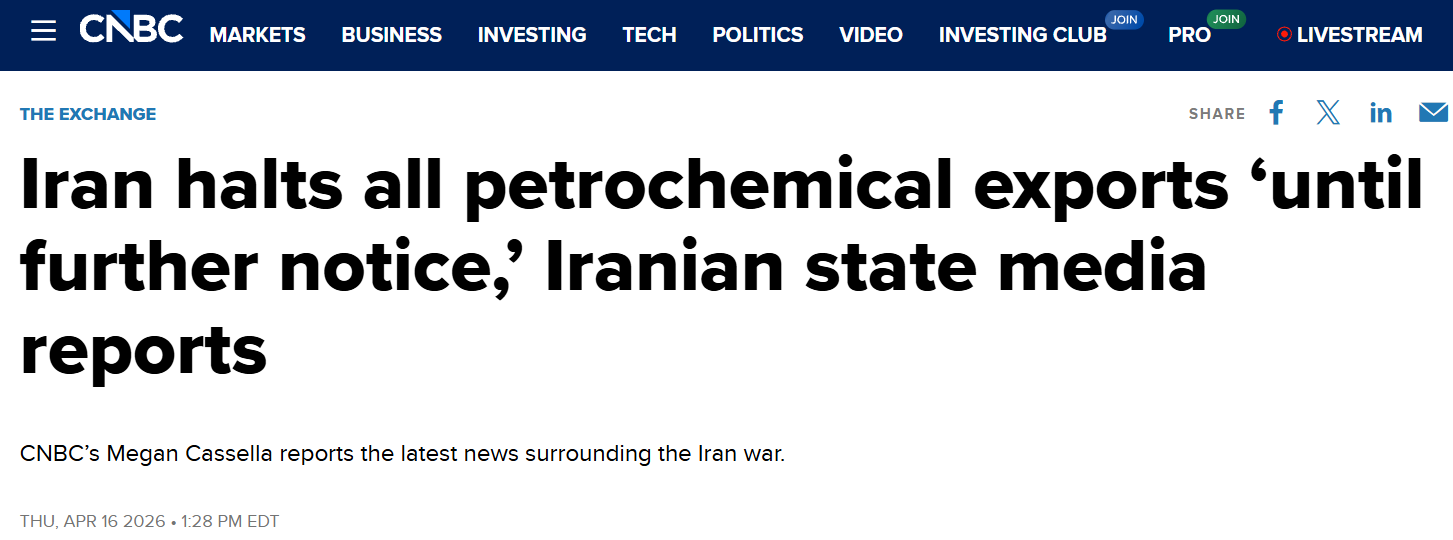 美国全国广播公司财经频道(CNBC)也在一则重大标题中写道:据伊朗官方媒体报道,伊朗暂停所有石化产品出口,“直至另行通知”。