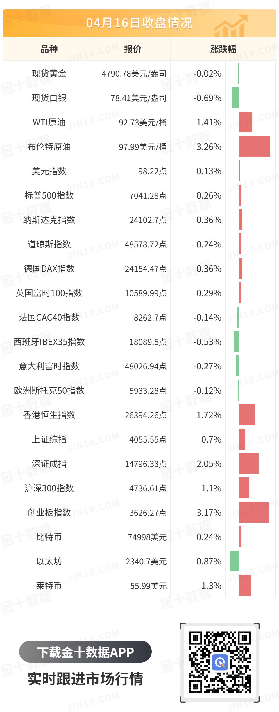 一些海湾国家和欧洲领导人认为,美伊达成和平协议可能需要约六个月,国际油价反弹。WTI原油最终收涨1.41%,报92.73美元/桶;布伦特原油最终收涨3.26%,报97.99美元/桶。