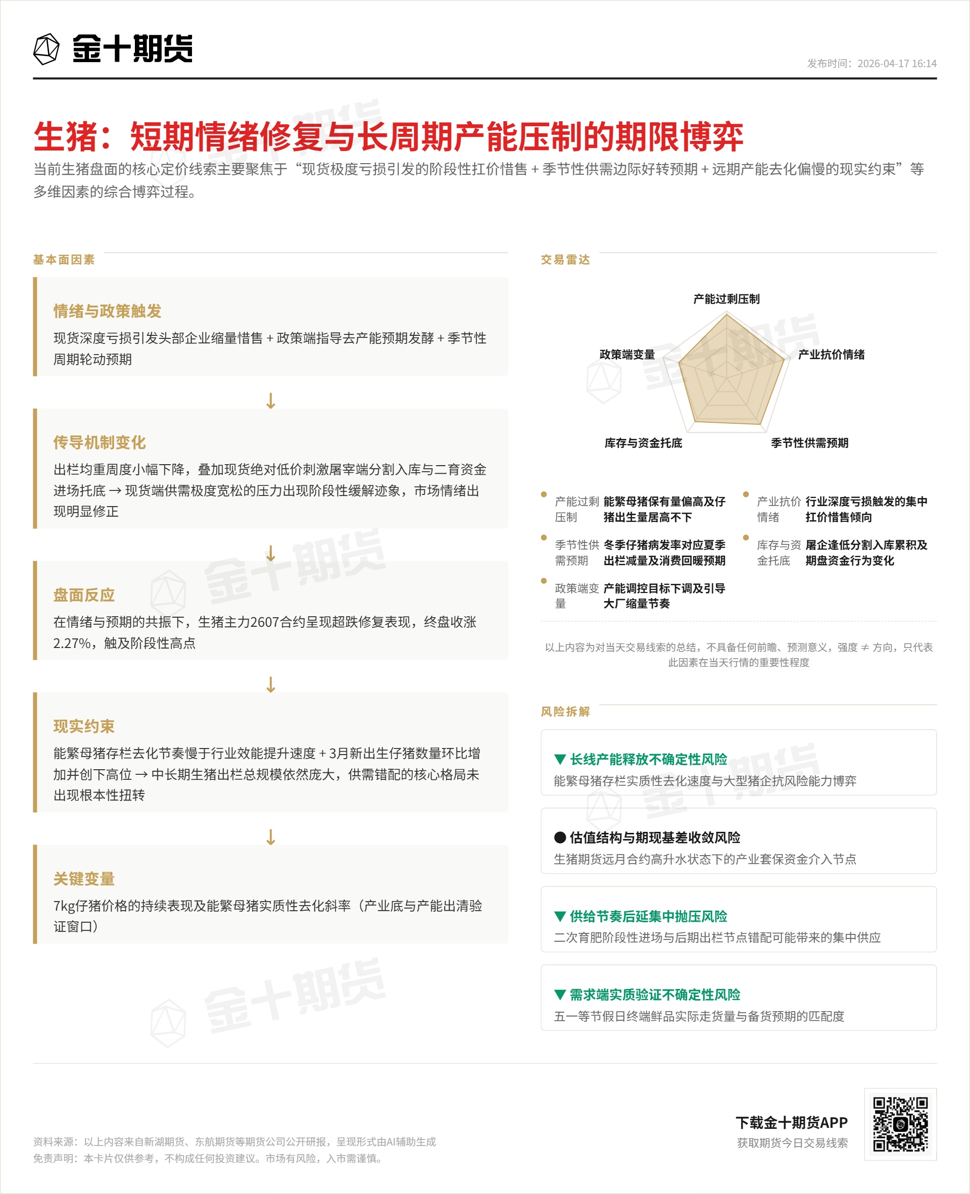 5小时前 【今日盘面线索·4月17日复盘】生猪:短期情绪修复与长周期产能压制的期限博弈