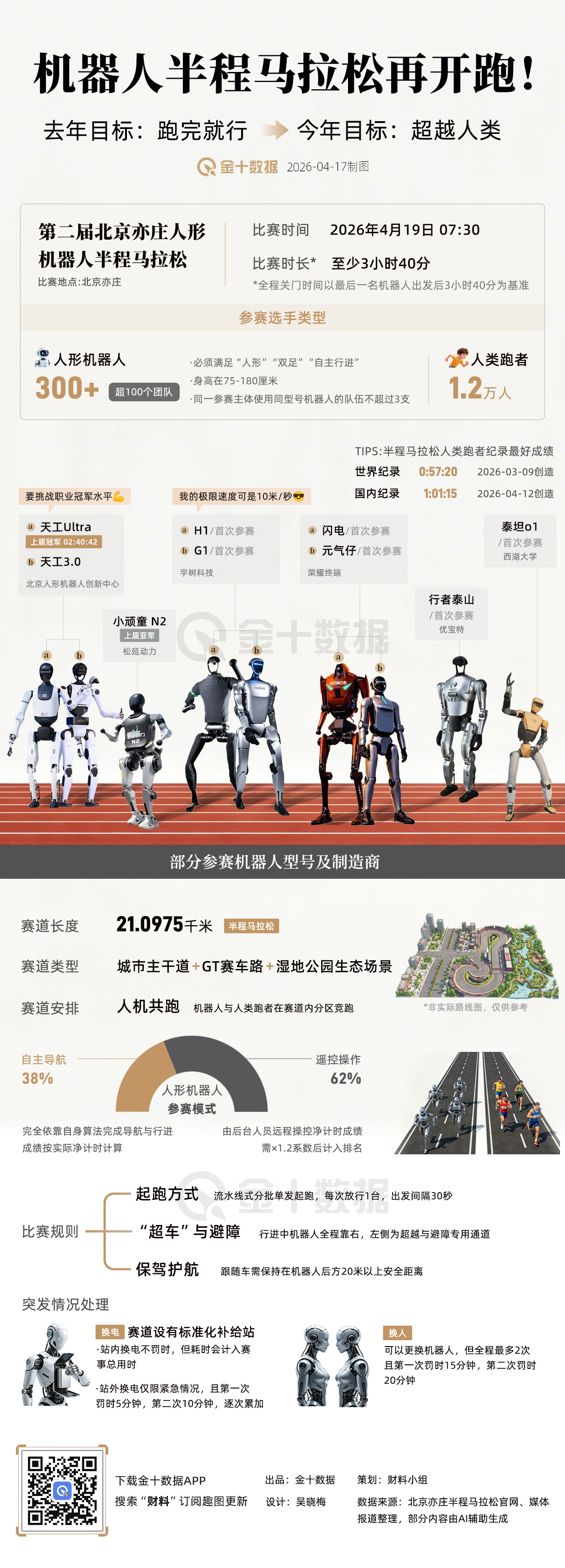 第二届北京亦庄人形机器人半程马拉松‌4月19日开跑,天工Ultra、宇树H1、松延动力N2等来自26个品牌的300多位“选手”将上阵比拼!
