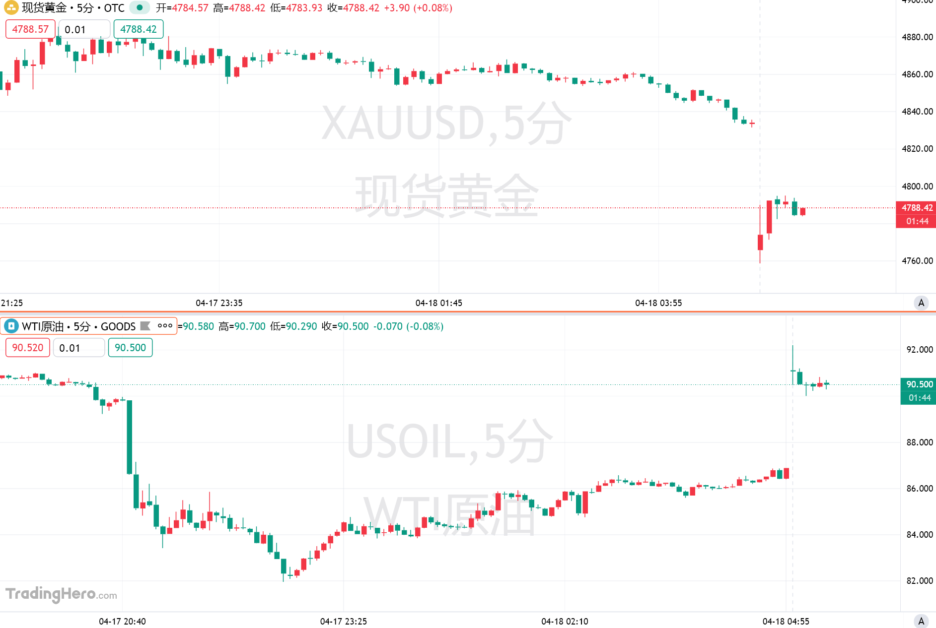 由于特朗普释放的乐观信息在周末被伊朗逐一驳斥,WTI原油周一跳空高开5%,报91.35美元/桶;美股三大股指期货集体低开,其中纳指期货跌0.9%。现货黄金跌破4830美元/盎司,低开1.41%。现货白银周一开盘跌超2%,报78.98美元/盎司。