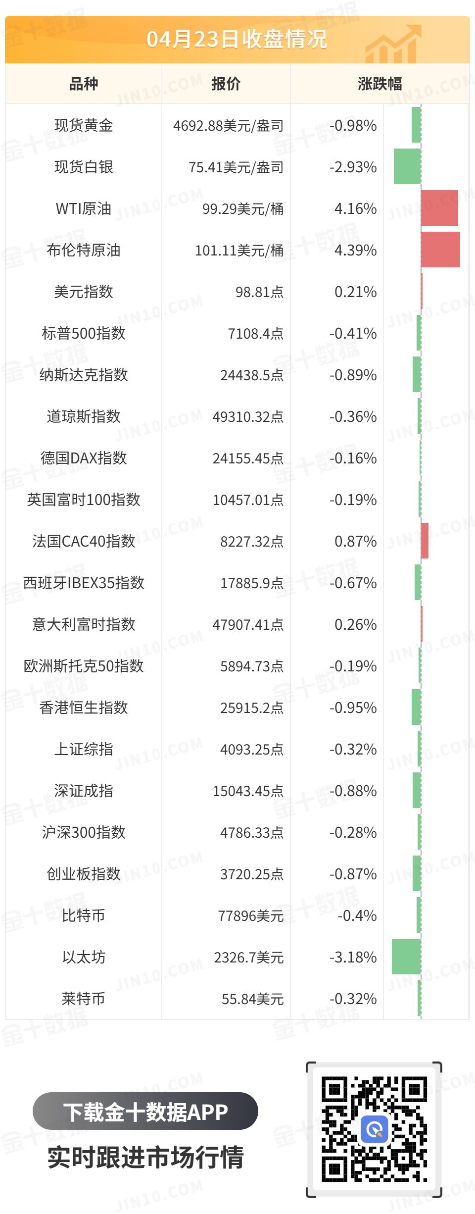 现货黄金日内震荡下跌,并跌破4700美元,最终收跌0.98%,报4692.88美元/盎司;现货白银最终收跌2.93%,报75.41美元/盎司。