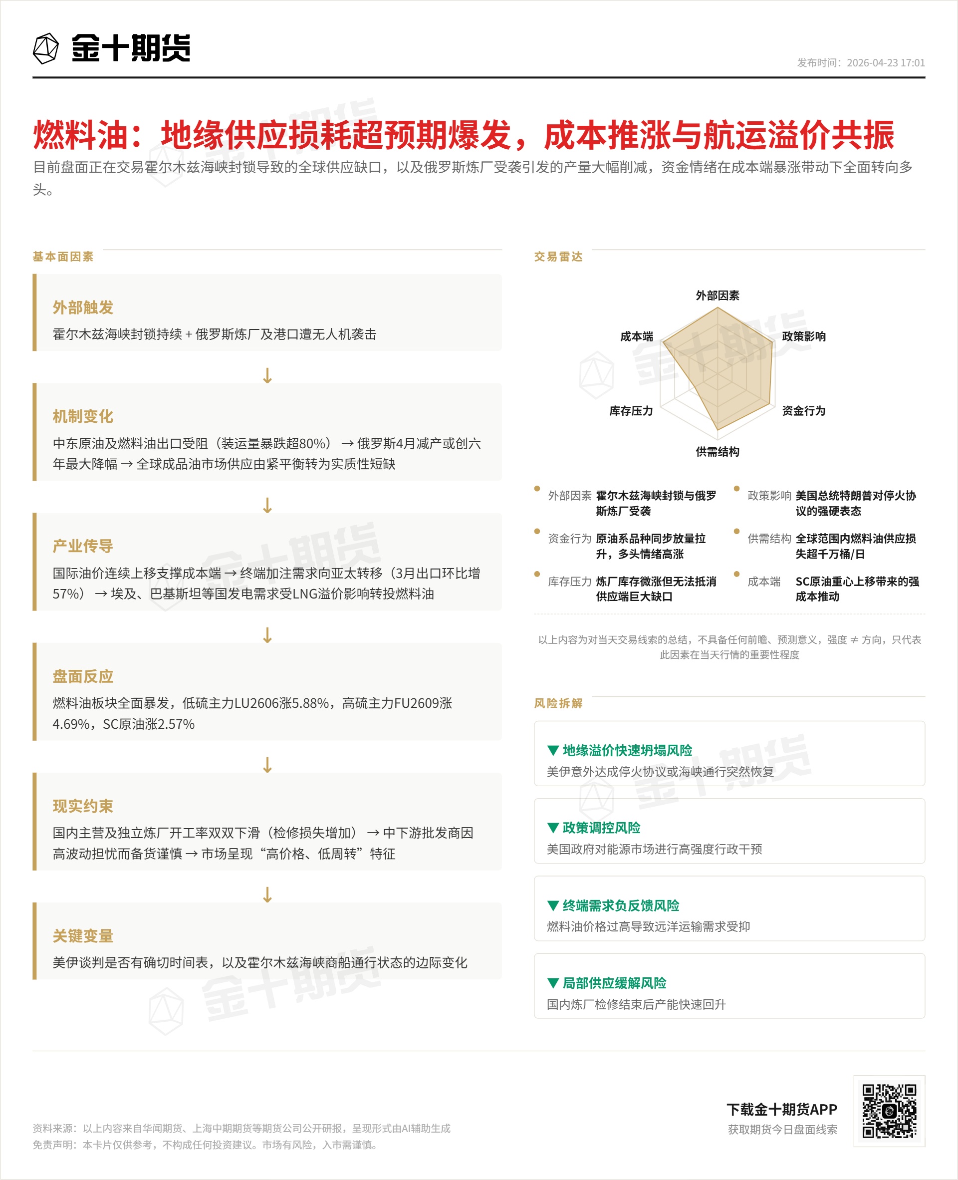 2小时前 【今日盘面线索·4月23日复盘】燃料油:地缘供应损耗超预期爆发,成本推涨与航运溢价共振