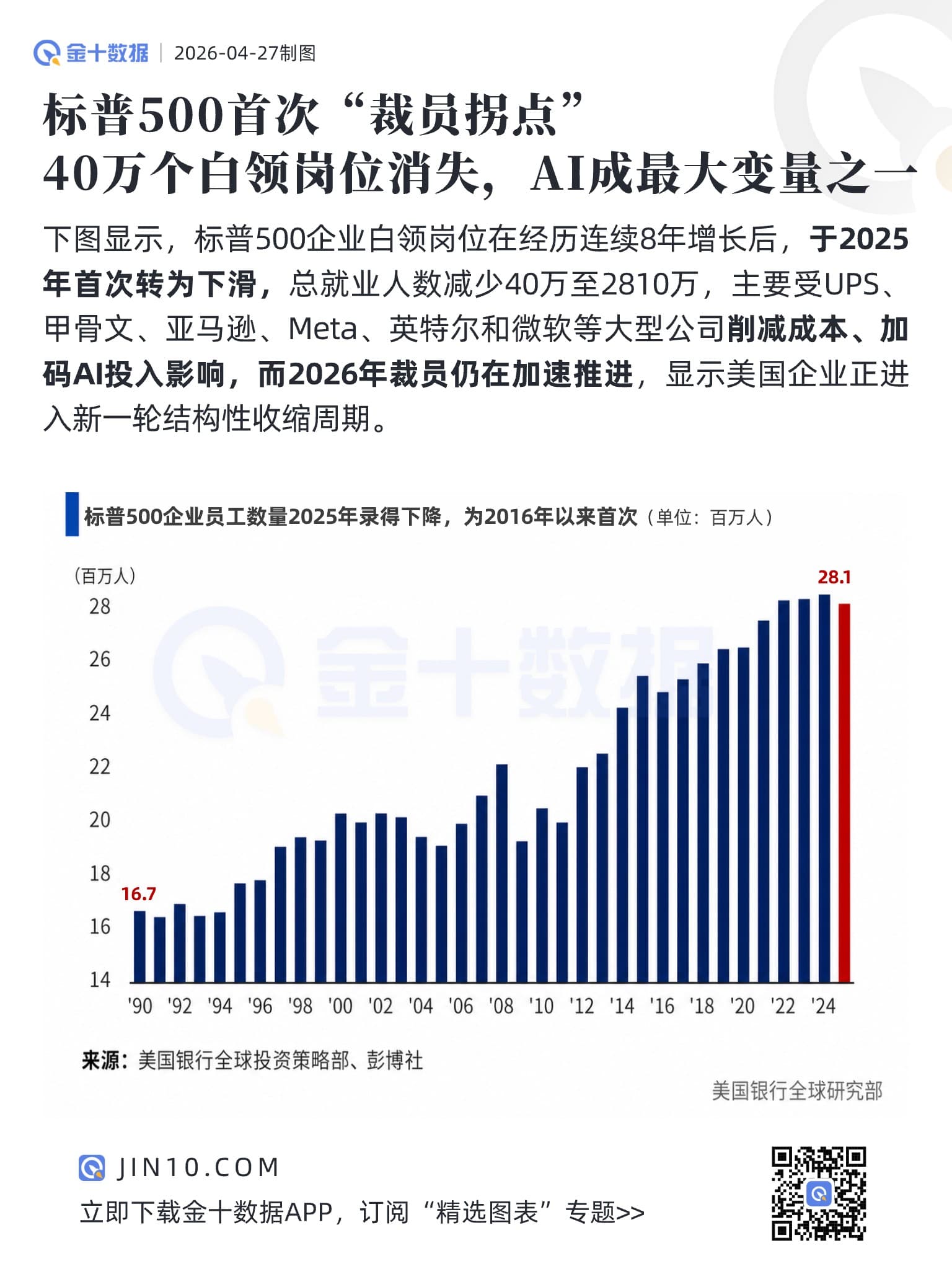 2小时前 标普500首次“裁员拐点”:40万个白领岗位消失,AI成最大变量之一
