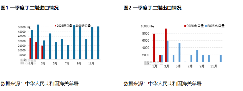导语:2026年一季度中国丁二烯进口量依旧大于出口量,但进口量同环比均下滑,出口量同环比均提升。二季度来看,中国丁二烯进口量或延续下滑趋势,出口量或维持增加,净进口格局或有所转变。