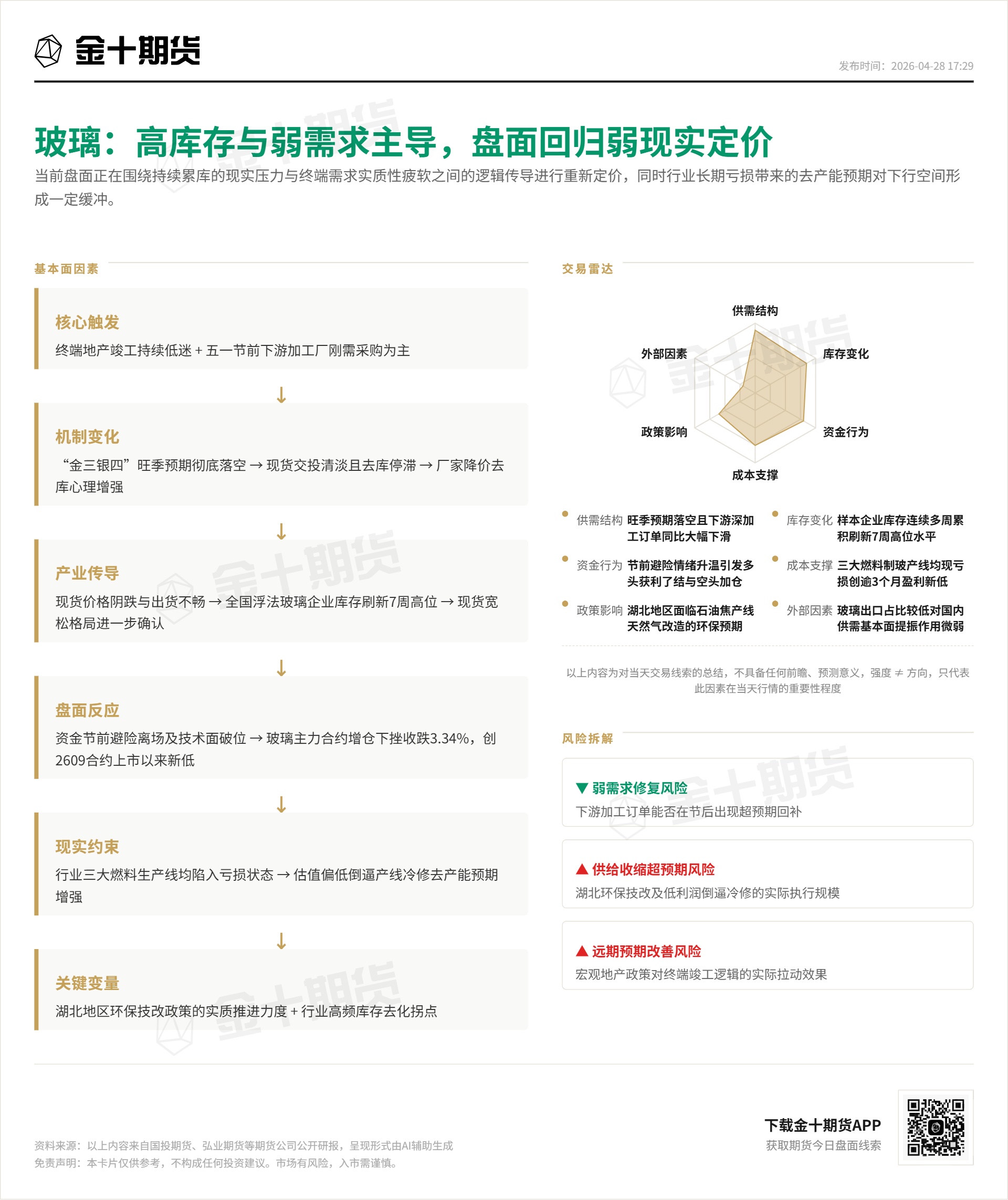 2小时前 【今日盘面线索·4月28日复盘】玻璃:高库存与弱需求主导,盘面回归弱现实定价