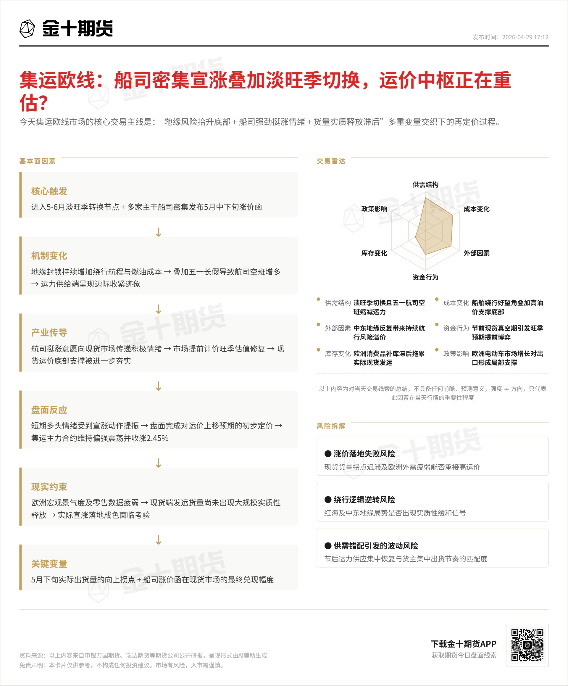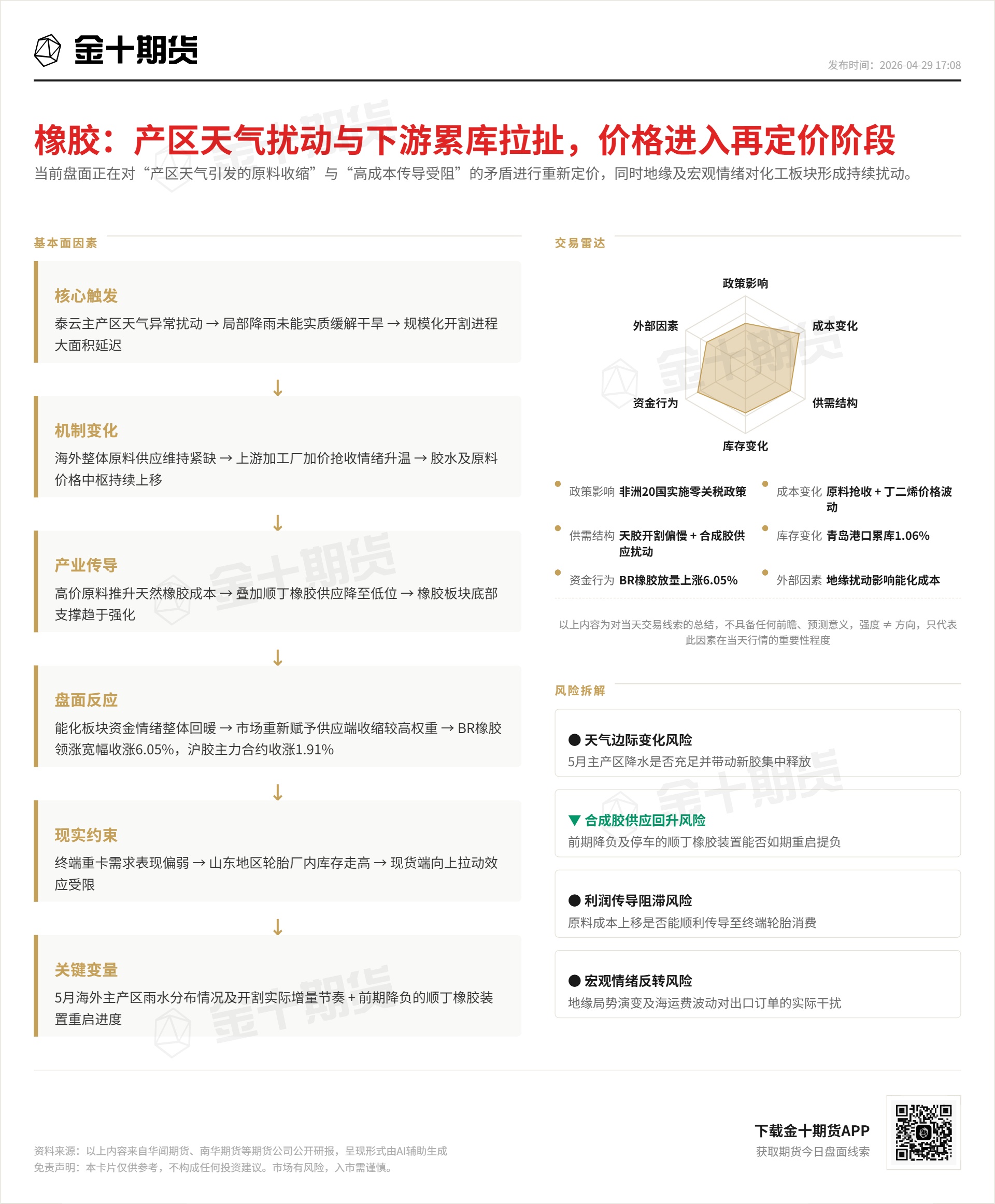 4小时前 【今日盘面线索·4月29日复盘】橡胶:产区天气扰动与下游累库拉扯,价格进入再定价阶段