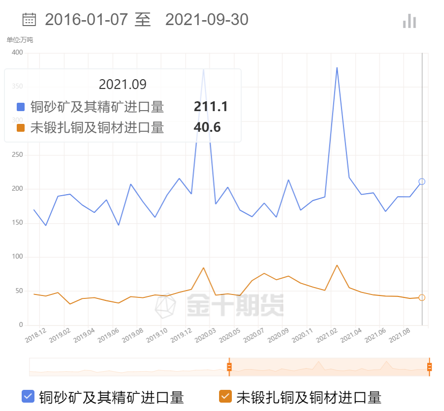 海关总署公布的数据显示,中国9月未锻轧铜及铜材进口量较上个月回升了3%,结束了连续五个月的下降,因此前疫情影响的发货量集中抵达中国;今年前九个月,未锻轧铜及铜材进口量同比下降19.5%,至401.9万吨。